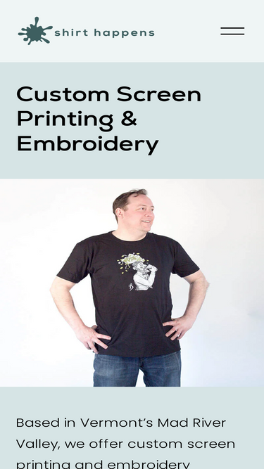 100%Shirt Happens - formerly Deerfield Designs - based in Waitsfield, VT, offers custom screen printing and embroidery services to clients of all sizes in Vermont, New England and nationwide. We work with your company, organization, product, or event by placing your unique screen printing or embroidery