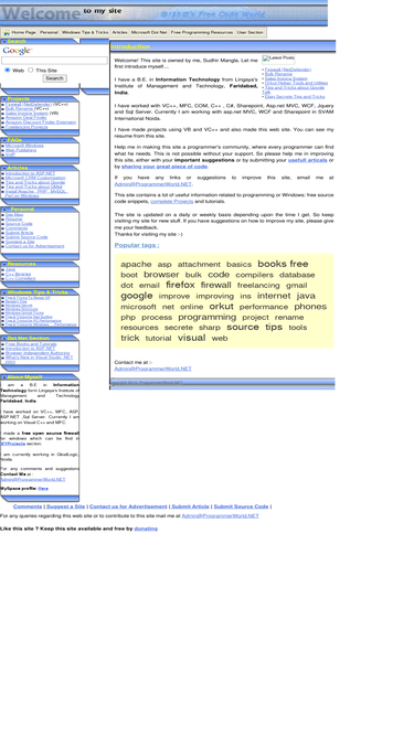 99%this site contains free books on c sharp , vb.net , ado.net , java , c++ , linux , unix and other programming topics. beside it contains articale and source code of free open source firewall for windows. it contains free tools , code , articles , libraries for various programming language.