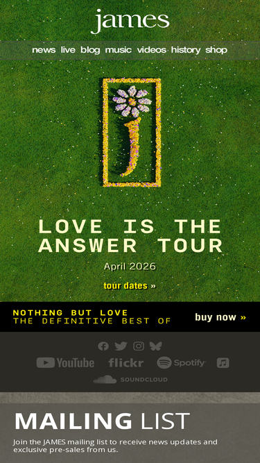 83%All the news, tour dates and more from the band James. Nothing But Love - The Definitive Best Of James is out now