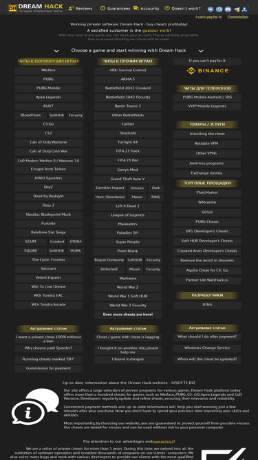 93%На ресурсе обсуждаются популярные игры, читы к ним и описываются процессы их создания. Читы для CS:GO, читы для PUBG и читы для Apex Legends — основное направление сайта. Кроме этого, у нас есть собственный магазин, где пользователи могут купить/продать аккаунты от своих игр и социальных сетей...