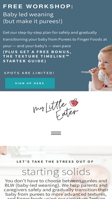 85%At My Little Eater, you’ll find easy-to-follow tips, how-to videos, strategies, and the latest research on feeding babies and toddlers. But most important, you get a team of pediatric dietitians, feeding experts, and fellow parents who support you no matter how you choose to feed your little one, whether you decide to ease into solids with purees, go straight to finger foods, or something in-between.