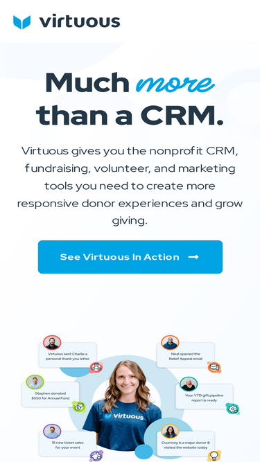 100%Virtuous gives you the nonprofit CRM, fundraising, volunteer, and marketing tools you need to create more responsive donor experiences and grow giving.