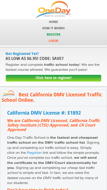 Our no stress California online traffic school is based on an engaging, fun and easy-to-read course. You are in charge as to where and when to study. Feel free to log on and off as you please and read through at your own pace.