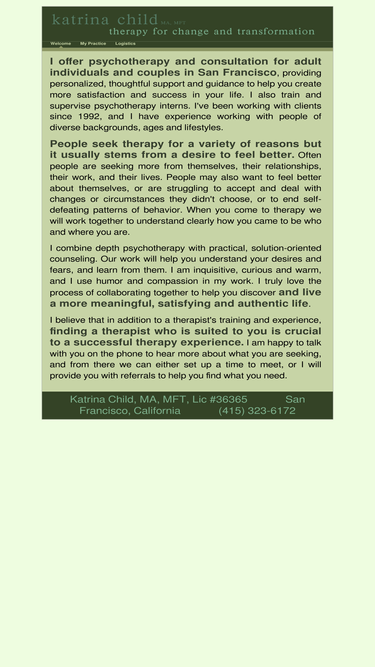 100%i offer psychotherapy and consultation for adult individuals and couples in san francisco, providing personalized, thoughtful support and guidance to help you create more satisfaction and success in your life. i also train and supervise psychotherapy interns. i have over 14 years of experience working with people of diverse backgrounds, ages and lifestyles.
