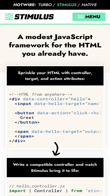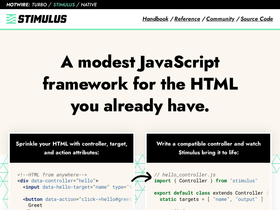 72%stimulus is a javascript framework with modest ambitions. it doesn’t seek to take over your entire front-end—in fact, it’s not concerned with rendering html at all. instead, it’s designed to augment your html with just enough behavior to make it shine.