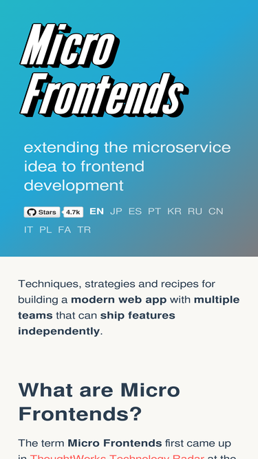 73%Techniques, strategies and recipes for building a modern web app with multiple teams using different JavaScript frameworks.