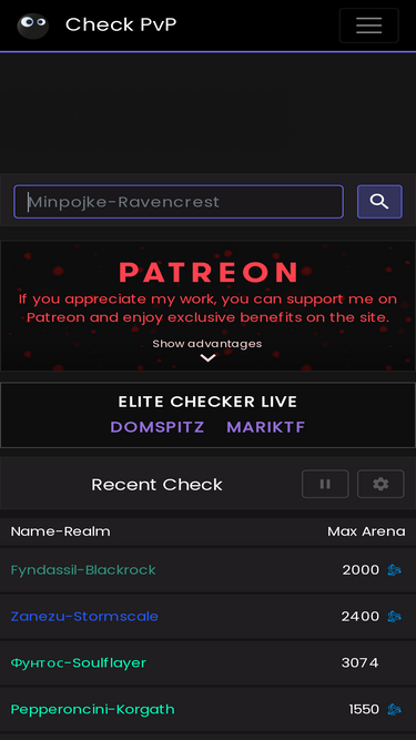 100%check-pvp, a tool to check pvp player experience. maximum rating reached, achievements dates, season ratios. displays information about alts (secondary characters).