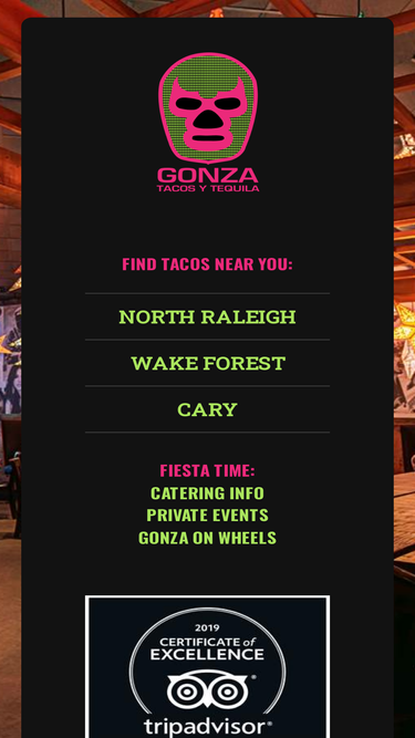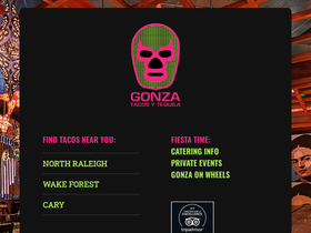 100%Find tacos near you: North Raleigh Downtown Raleigh Wake Forest Durham Cary Fiesta Time: CATERING INFO PRIVATE EVENTS GONZA ON WHEELS