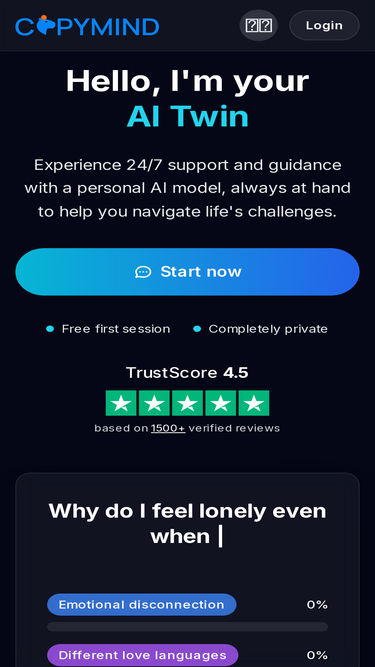 78%Transform your life with COPYMIND, your personal AI twin. Enhance self-awareness, improve decision-making, and navigate life's challenges with 24/7 AI support.