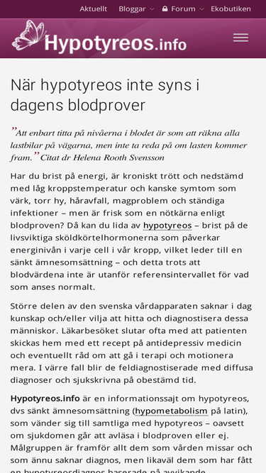 98%En informationssajt om hypotyreos, dvs sänkt ämnesomsättning (hypometabolism på latin), som vänder sig till samtliga med hypotyreos – oavsett om sjukdomen går att avläsa i blodproven eller ej.