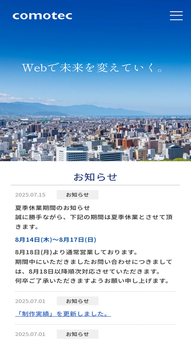 96%コモテック(comotec)は、愛媛県松山市のweb制作会社です。ホームページ制作・ecサイト制作・lp制作・デザイン・動画制作等、サイト制作実績1000件以上。ホームページ制作からアフターフォロー・保守管理までサポートいたします。webに関することは何でもご相談ください。