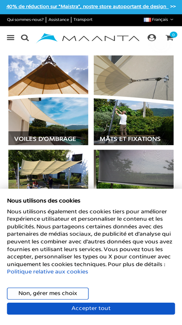 89%OFFRES de voile pour jardins Maanta. Vente en ligne de voiles d'ombrage standard et sur mesure de haute gamme, de mâts, de poteaux et de fixations.