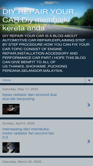 100%DIY REPAIR YOUR CAR IS A BLOG ABOUT AUTOMOTIVE CAR REPAIR,EXPLAINING STEP BY STEP PROCEDURE HOW YOU CAN FIX YOUR CAR.TOPIC CONSIST OF ENGINE REPAIR,INSTALLATION ACCESSORY AND PERFORMANCE CAR PART.I HOPE THIS BLOG CAN GIVE BENIFIT TO ALL OF US.THANKS..SHOHAIME ,PUCHONG PERDANA,SELANGOR.MALAYSIA.