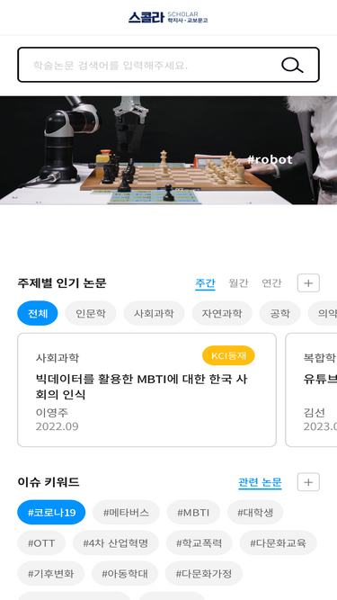 95%학지사ㆍ교보문고 스콜라 서비스는 이용자의 환경을 고려하여 최적화된 사용환경 제공으로 빠르고 정확한 검색 및 편리한 이용이 가능한 학술정보 서비스 입니다.