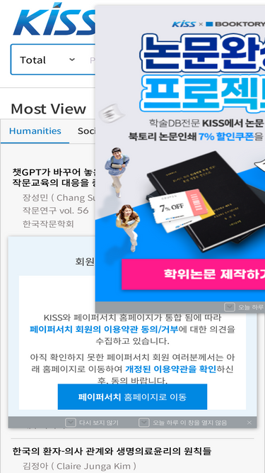 77%학술논문검색사이트 KISS는 학술논문,연구논문,연구자료,학술지 등 다양한 자료를 서비스하며, 주제별, 등재별, 인용지수, 인기논문, 이슈논문 등 다양한 키워드의 논문을 제공하여 빠른 학술검색 및 인용이 가능하도록 서비스합니다.