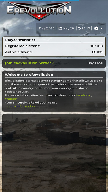 62%Multiplayer strategy game that allows users to run the economy, conquer other nations, become a politician and rule a country,or liberate your country and start a resistance war.