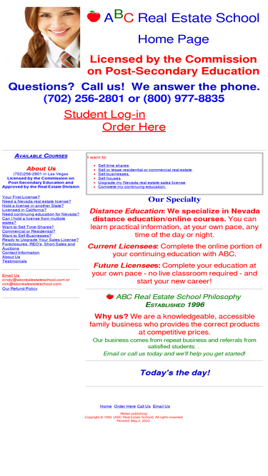 88%Contact Us Give us a call, email us or submit this form. Address 800 N Rainbow Blvd, Ste. 208-6 Las Vegas, NV 89107 Phone 702-256-2801 or 800-977-8835 Email Rick: rick@abcrealestateschool.com Cindy: cindy@abcrealestateschool.com Send Us a Message Please enable JavaScript in your browser to complete this form.Name *Email *Subject *Message * Submit