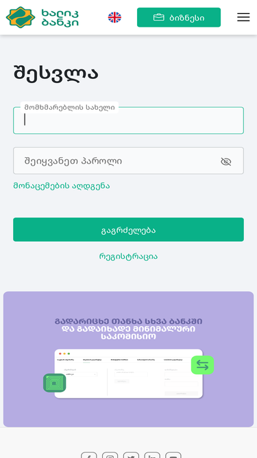 92%ბაზისბანკის ინტერნეტ ბანკი არის თქვენი საბანკო ანგარიშების მართვის თანამედროვე, მოხერხებული და უსაფრთხო სისტემა. ელექტრონული საბანკო მომსახურებით თქვენ შეძლებთ მსოფლიოს ნებისმიერი წერტილიდან, 24 საათის განმავლობაში, აკონტროლოთ და თვალი ადევნოთ თქვენს ანგარიშებზე ბრუნვებს, გადაიხადოთ კომუნალური და საკომუნიკაციო გადასახადები, გადარიცხოთ თანხა ლარსა და უცხოურ ვალუტაში ნებისმიერი მიმართულებით!