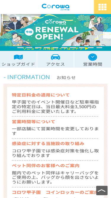 65%阪神電車甲子園駅前のショッピングセンター「コロワ甲子園」の公式サイトです。イオンスタイルをはじめ、いつもの暮らしを快適に彩りを添えるショップ、レストラン、サービスなど約65店舗が揃います。