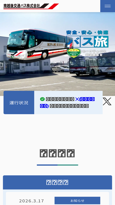 89%新潟県南魚沼市所在の南越後観光バス株式会社の公式ウェブサイトです。六日町、湯沢、小出、小千谷、津南、十日町地区の一般路線バスや、貸切・観光バスを運行しています。