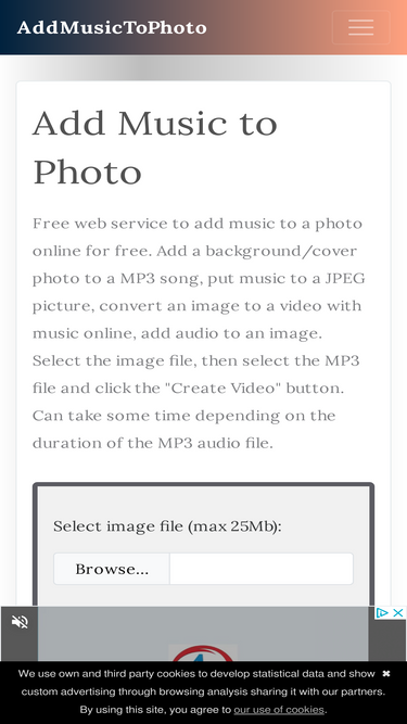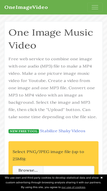 82%Free web service to combine one image with one audio (MP3) file to make a MP4 video. Make a one picture image music video for Youtube. Create a video from one image and one MP3 file. Convert one MP3 to MP4 video with an image as background.