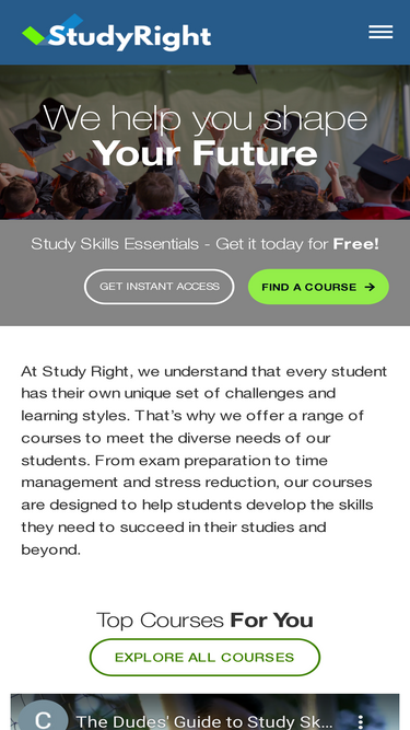 28%We help you shape your future Mastering Student Organization - Get it today for Free! GET INSTANT ACCESS FIND A COURSE At Study Right, we understand that every student has their own unique set of challenges and learning styles. That's why we offer a range of courses to meet the diverse needs of our students. From exam preparation to time management and stress reduction, our courses are designed to help students develop the skills they need to succeed in their studies and beyond. Top Courses For You EXPLORE ALL COURSES https://www.youtube.com/watch?v=F8Qg-rqpx20 Medium The Dudes' Guide to Study Course Help your