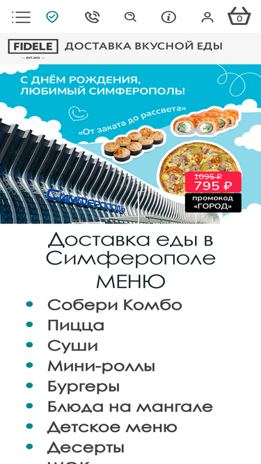 87%Доставка суши, роллов и пиццы в Симферополе "Fidele" – бесплатная доставка суши, пиццы, шашлыка, заказ еды на дом или доставка обедов в офис.