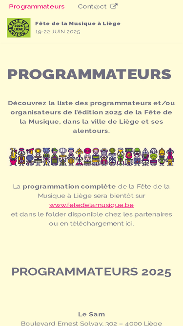 76%Découvrez la liste des programmateurs/organisateurs de l'édition 2024 de la Fête de la Musique, dans la ville de Liège et ses alentours.