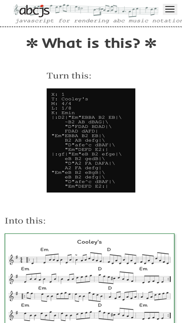 abcjs allows web designers and programmers to add sheet music and audio to their websites using the ABC music notation standard and a tiny amount of JavaScript. The music can be animated and can be dynamically created.