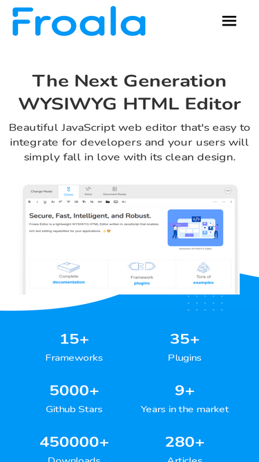 92%Froala's WYSIWYG Editor is a beautiful JavaScript web editor that's easy to integrate for developers and your users will fall in love with its clean design.