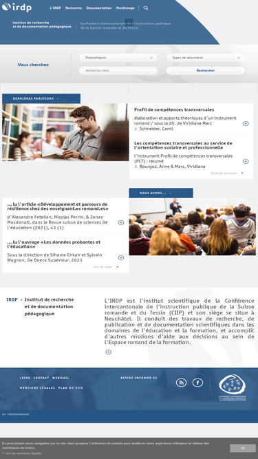 80%Adresse Institut de recherche et de documentation pédagogique (IRDP) Fbg de l'Hôpital 43 - 45 / CP 556 2002 Neuchâtel SUISSE Secrétariat +41 32 889 86 00 info@irdp.ch Bibliothèque +41 32 889 86 18 documentation@irdp.ch → Horaire de la bibliothèque Se rendre à l'IRDP A pied de