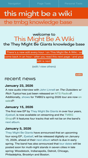 67%This Might Be A Wiki is an ever-growing reference for all things They Might Be Giants. Anyone can edit and contribute!