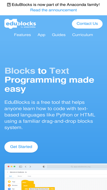 92%edublocks is a free tool by anaconda that helps anyone learn how to code with text-based languages like python or html using a familiar drag-and-drop blocks system