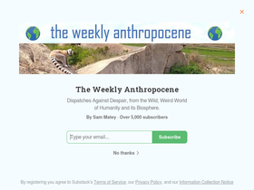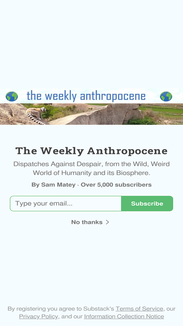 85%dispatches against despair, from the wild, weird world of humanity and its biosphere. click to read the weekly anthropocene, by sam matey, a substack publication with thousands of subscribers.