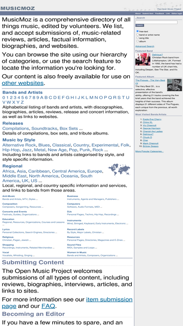 96%a comprehensive directory of all things music, edited by volunteers, listing music-related reviews, articles, factual information, biographies, and websites.