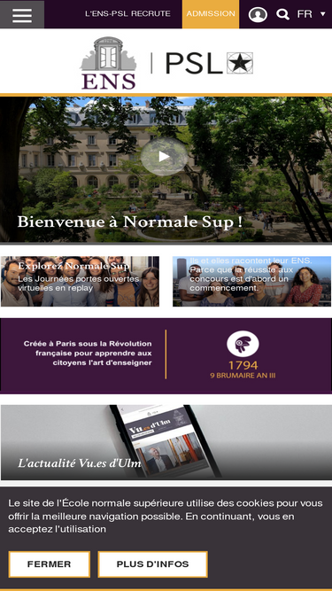 90%l’ens est un établissement public à caractère scientifique, culturel et professionnel (epscp) au sens de l’article l. 716-1 du code de l’éducation placé sous l’autorité directe du ministre chargé de l’enseignement supérieur. elle est soumise aux dispositions de ce même code et des textes pris pour son application sous réserve des dérogations prévues au présent décret. a la fois grande ecole et université, l’ecole normale supérieure dispense à paris, au cœur du quartier latin, une formation d’excellence par la recherche conduisant aux différents métiers de l’enseignement et de la recherche, et concourt à la formation par la recherche des cadres supérieurs des administrations publiques et des entreprises françaises et européennes. elle définit et met en œuvre une politique de recherche scientifique et technologique dans une perspective multidisciplinaire et internationale. depuis 2012, l’ecole normale supérieure est dirigée par le physicien marc mézard.