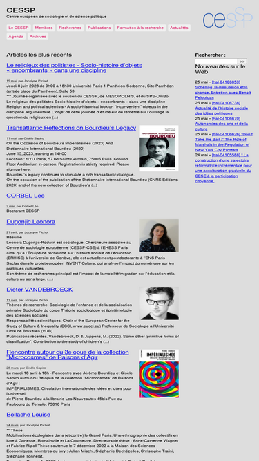 80%Le Centre européen de sociologie et de science politique (CESSP) est une Unité mixte de recherche en sciences sociales rattachée au CNRS, à l’Université Paris I-Panthéon-Sorbonne et à l’École des hautes études en sciences sociales (UMR 8209).