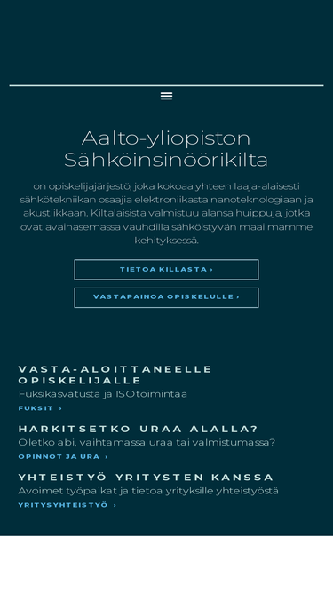 94%aalto-yliopiston sähköinsinöörikilta ry on otaniemessä vaikuttava opiskelijajärjestö, joka on perustettu vuonna 1921. kilta järjestää kaikenlaista toimintaa liittyen opintoihin ja vapaa-ajan viettoon.