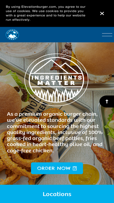 Order Pickup & Delivery. Elevation Burger Official site. Certified Organic, 100% Grass-Fed Beef Burgers and fresh fries cooked in heart-healthy olive oil.
