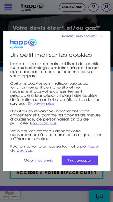 61%happ-e.fr, votre fournisseur d'électricité et de gaz moins cher. avec happ-e, bénéficiez d'un service client ouvert 6j/7, du paiement à plusieurs ou encore de la date de règlement personnalisée gratuitement. déménager ou changer de fournisseur, c'est facile !
