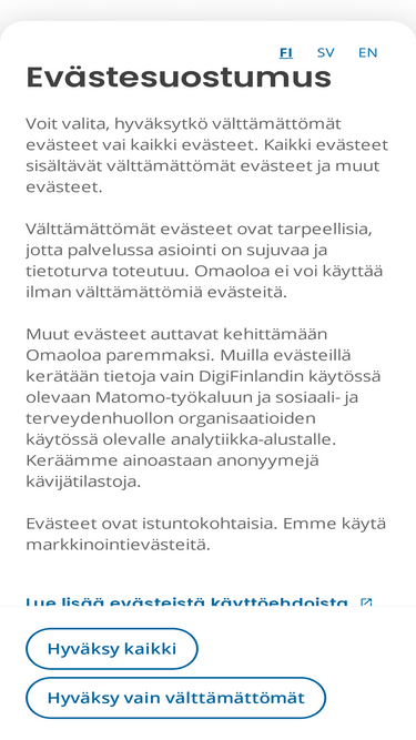 78%Omaolo on kansallinen digipalvelu, joka auttaa sinua arvioimaan hoidon tai palvelun tarvettasi. Omaolo ohjaa sinut oikean avun luo.