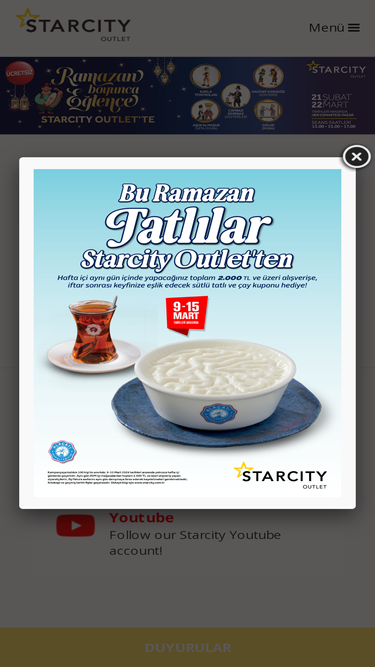56%starcity outlet avm alışveriş ve eğlenceyle ilgili hayallerinizin gerçekle buluşacağı bir yer. yıl boyunca dünya markaları, çok uygun fiyatlarla ve sürekli yenilenen fırsatlarla sizi bekliyor.