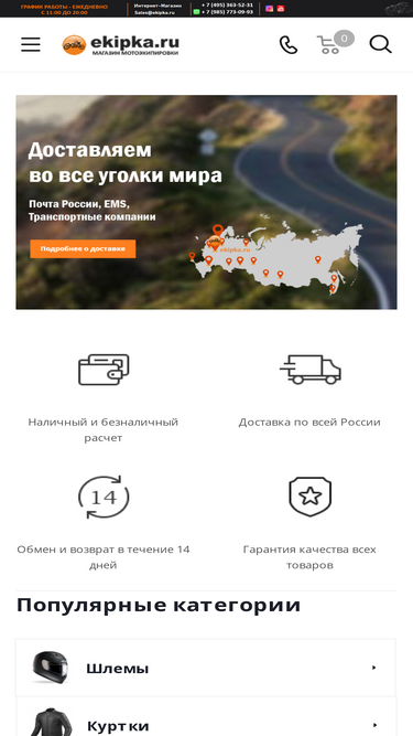 84%Интернет-магазин ekipka.ru осуществляет продажу мотоэкипировки. У нас вы можете выбрать и купить экипировку SIDI, Revit, HJC, Clover, Forma и других известных брендов. Вопросы и ответы. Наш телефон в Москве: +7 (495) 363-52-31