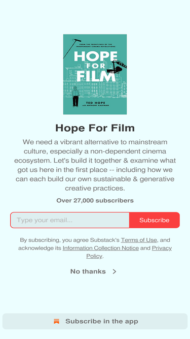 92%We need a vibrant alternative to mainstream culture, especially a non-dependent cinema ecosystem. Let's build it together & examine what got us here in the first place -- including how we can each build our own sustainable & generative creative practices. Click to read Hope For Film, by Ted Hope, a Substack publication with tens of thousands of subscribers.