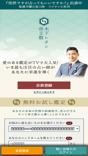 73%【木下レオン公式占い】フジテレビ「突然ですが占ってもいいですか?」出演後、あまりの的中率の高さから芸能界より依頼が殺到。有名芸能人も驚愕&絶賛した木下レオンの秘術≪帝王数≫の的中力をご堪能ください。【無料占いあり】