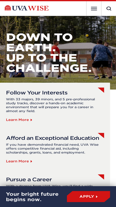 80%The University of Virginia’s College at Wise is a public, four-year residential liberal arts college located in the beautiful mountains of Southwest Virginia.