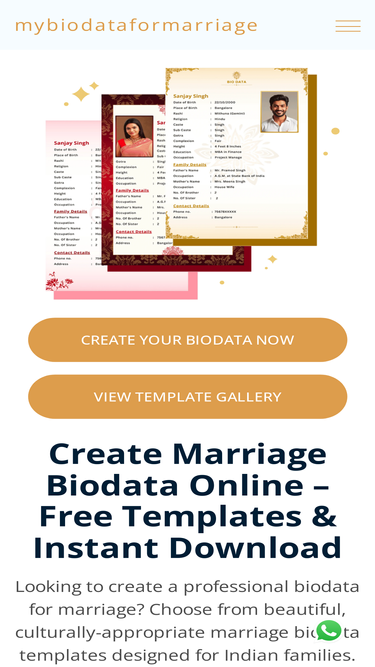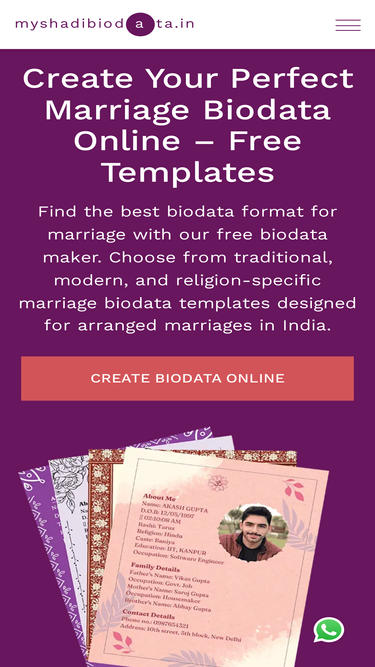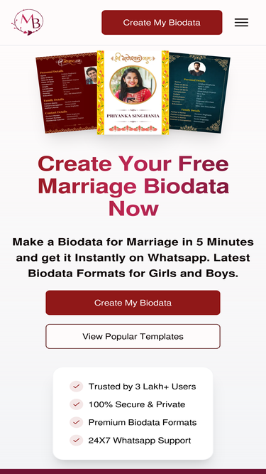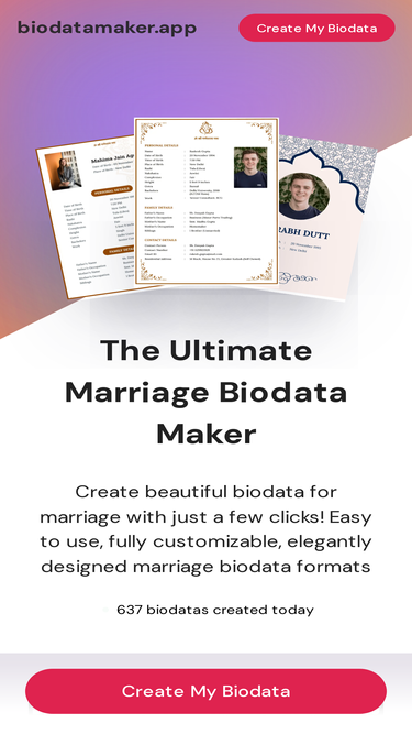 91%Create your marriage biodata in 3 simple steps. Choose free professional templates, add your details & download PDF instantly. Fast, simple & stunning biodata maker.