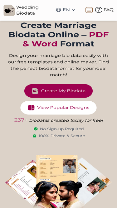 100%Create marriage biodata online in 5 minutes using ready-made templates. Customize details and download wedding bio data in PDF or Word format.