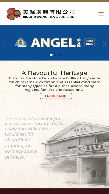 100%Bidor Kwong Heng is a leading and trusted sauce and condiments manufacturer in Malaysia, specializing in the production of naturally brewed soy sauce, bean paste and a wide range of other popular sauces. Since its inception in 1945, Bidor Kwong Heng has progressed rapidly and is now recognized as a leading international-class manufacturer. Its flagship Angel Brand is a household name in Malaysia, and can also be found in many countries across the globe.