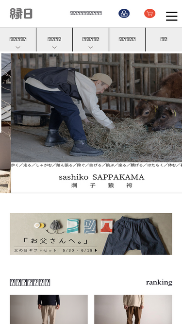 89%.info_shipping { display:none !important; }永久修繕保証付き… ほつれ・破れのお直し 基本無料(何度でも) / 染め直し無料(初回のみ)お直し基本無料 / 染め直し初回無料 商品について サイズ・素材 着用イメージ 東北に伝わる、猿のように軽快に動ける万能ズボン「猿袴」。東北に古くから伝わる野良着「猿袴」はその名の通り、猿のように軽快に野山を動くことができる袴です。自然と共に農的な生活を営んできた東北で、山仕事や農作業の作業着として、またモンペのように部屋着としても愛用されてきました。猿袴の特徴はお尻に適度な生地のゆとりがあることや、ふくらはぎから足首にかけて細く作られていること。それらは山での動きやすさや、足運びをよくするために考えられた形です。昨今ではあまり見ることのない猿袴のような形は、現代よりも動きの多い暮らしの中で、より快適に過ごすための工夫が詰め込まれています。猿袴の魅力は昔の暮らしだけではなく、今の暮らしにも寄り添い、より楽しく快適にしてくれるはず。そう思い、縁日の「SAPPAKAMA」を作りました。からだに馴染み、足の動きを軽やかに。SAPPAKAMAはゆとりのある腰回りから太ももにかけてのシェイプと、キュッとしまったひざ下が特徴的です。サルエルパンツのように、お尻の部分に生地のゆとりを持たせることにより、足の可動域を妨げず、より動きやすい形を作っています。また後ろからのシルエットが悪くならないよう何度も試作を重ね、動きやすさもシルエットもちょうど良い、今の形に辿り着きました。立体的な作りのふくらはぎ回りには、他のパンツには見られない、昔ながらの猿袴の形を採用しています。三角の切り返しがあることによって、より足にフィットし、動きやすさと着心地のよさを実現しました。一見シンプルに見える形ですが、何枚ものパーツが組み合わさった立体縫製となっており職人の技術がつまっています。履きやすさと使いやすさも重視して。ウエストは脱ぎ履きが楽なように、ウエストゴムを使用。締め付けの調整は、従来の猿袴に習って紐で結ぶ仕様にしています。ポケットは両脇に2つ、後ろに1つ付いています。大きめのポケットなので、携帯電話やお財布も楽に入ります。ちょっとした外出なら、手ぶらでお出かけもできます。どんなスタイルにも合わせやすい、落ち着いた5色。SAPPAKAMAのカラーバリエーションは「紺」「生成り」「カーキ」「グレー」「黒」の5色。派手ではない色合いだからこそ、日常で使いやすいアイテムです。カジュアルから少しかっちりとした格好まで、さまざまな場面でのコーディネートをお楽しみいただけます。■ご注意事項染色の都合上、商品ごとの色差が発生することがございます。あらかじめご了承ください。【カーキの例】【グレーの例】ナチュラルな風合いを感じられる綿麻の生地。SAPPAKAMAは、綿麻キャンバスの「生成り」の生地を使用し作られています。中厚手生地なので、生成色でも透けることはありません。生成地に染めや洗い加工を施して仕上げており、生地表面に自然なシボ、しわ感があります。綿と麻の天然繊維で作られているため、使えば使うほど、生地がやわらかく体に馴染んでいきます。生成の生地は原料となった植物の繊維など、自然のままのナチュラルな風合いが感じられる生地です。また、生地を仕上げる際に、薬品や人の手が加わる工程が少なく、その分環境への負荷も少ないのものでもあります。暮らしに寄り添う道具を作る、私たち縁日にぴったりな生地だと思いセレクトしました。綿麻キャンバス地(綿50%:リネン25%:ラミー25%)〜お知らせ〜2025年9月26日注文分から使用している生地の混率が順次変更となります。【変更前】綿50%:麻50%【変更後】綿50%:リネン25%:ラミー25%風合いや使用感はほとんど変わりませんのでご安心ください。■ご注意事項生成生地は、原料となった植物の繊維など自然の風合いを感じられる生地ではありますが、それが原因で染色時に色むら・色抜けが発生する場合もあります。検品の段階で目立つ色抜け等については弾いておりますが、上記のような、生地自体の特徴による僅かな色むら・色抜けにつきましては、風合いの範囲内とし出荷させていただいておりますので、ご了承くださいますようお願いいたします。'あるものを使う'東北の知恵が詰まった裂織ループ。製造過程でどうしても出てしまう残布で裂織のループをつけました。 東北の物を大切にする象徴としてのアイコンでもあり、暮らしの道具としてループにフックなどを引っ掛けることもできます。※残布を使用しているので、裂織の色合いは写真と異なる場合